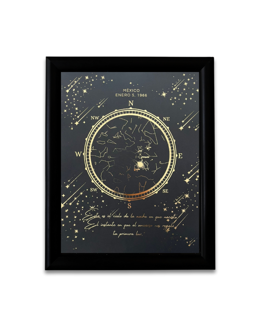 Recrea el cielo exacto que había sobre un lugar y una fecha que marcó tu historia. Un diseño sofisticado en negro profundo con detalles dorados, pensado para verse elegante en cualquier espacio y, al mismo tiempo, conservar un recuerdo irrepetible.